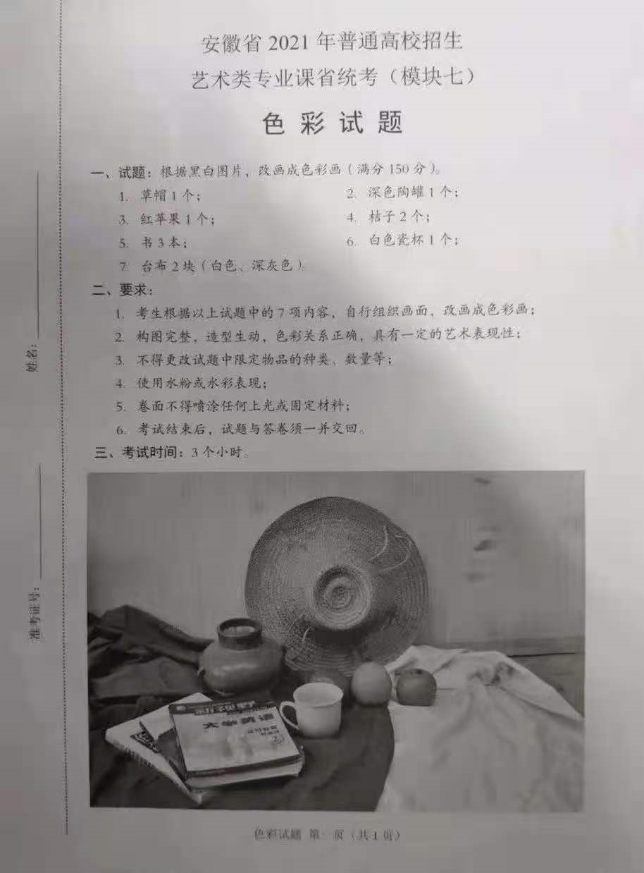 素描考题: 男青年头像。 色彩考题: 静物组合,鲜花、陶罐、白瓷瓶、水果店、水果、两块衬布等。 速写考题: 双人速写,一个男学生(站姿)抱着大桶纯净水,另一个男学生(坐姿)拿着一次性水杯接水。 安徽省 HEMA ART
