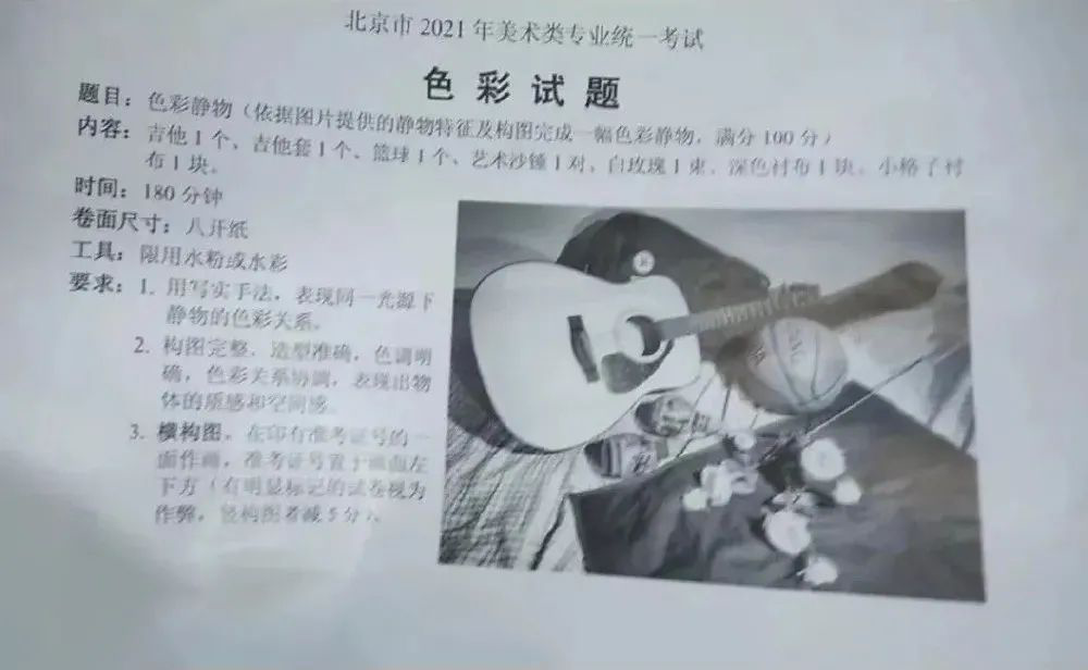 素描考题: 老年女性头像带手(画照片)。 色彩考题: 照片模拟写生,吉他1个、吉他包1个、篮球1个、艺术沙锤一副、白玫瑰1朵、深色衬布、1块格子衬布1块。 速写考题: 牵手的女子与儿童。 上海市 WUYUEART 素描考题: 女青年头像。 色彩考题: 静物组合。 速写考题: 多人速写组合。 广东省 HEMA ART