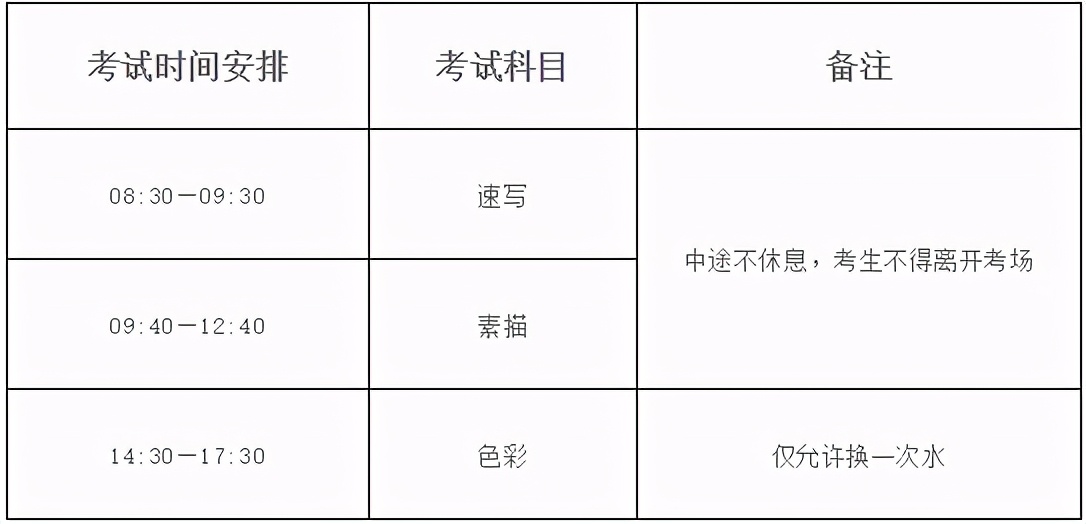 5.考试期间不得中途交卷离场。考试结束前30分方可交卷。速写科目结束、素描科目开始期间为试卷收发时间,考生不得中途离场。考试发放的所有材料一律不准带出考场,交卷后待监考老师确认无误后方可有序离开考场,离开考场后不可在考场周围逗留。